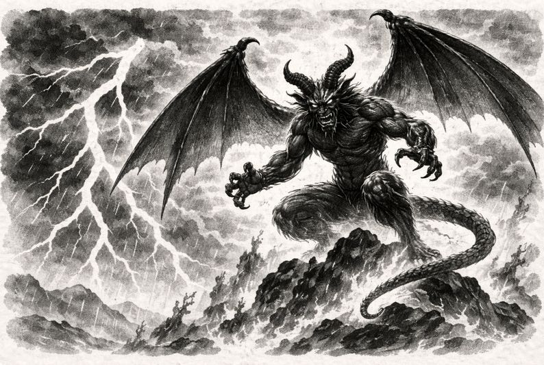 翼と角を持つ獣の姿で描かれ、荒天の象徴として視覚化されている。