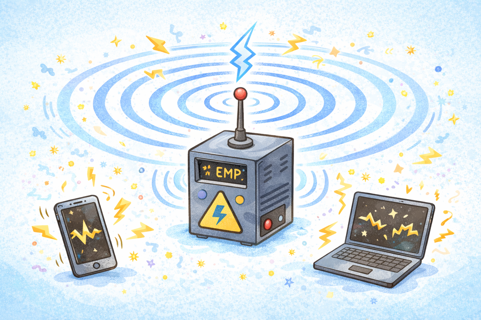 EMPっつーのはよォ、ただの電磁波じゃねぇ!ケタ違いのパワーで一瞬にして電子機器をブチ壊す“電気の爆弾”だ!しかも見えねぇ、聞こえねぇ、来たと思ったら全部パーよ!チップだの基板だの、EMPの前じゃ紙同然だぜ!